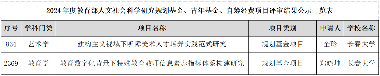 近日,教育部社科司发布了2024年度教育部人文社会科学研究一般项目评审结果,我校特殊教育学院全玲副教授的项目《建构主义视域下听障美术人才培养实践范式研究》、郑晓坤教授的项目《教育数字化背景下特殊教育教师信息素养指标体系构建研究》获批教育部人文社科规划基金项目。