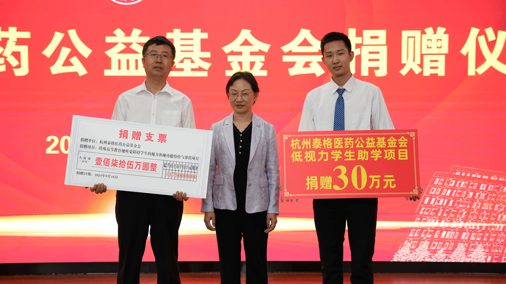 曹晓春代表杭州泰格医药公益基金会向特殊教育学院师生代表进行捐赠,支持特殊高等教育视听觉障碍学生的视力和视功能特检与帮扶项目175万元、低视力学生助学项目30万元。