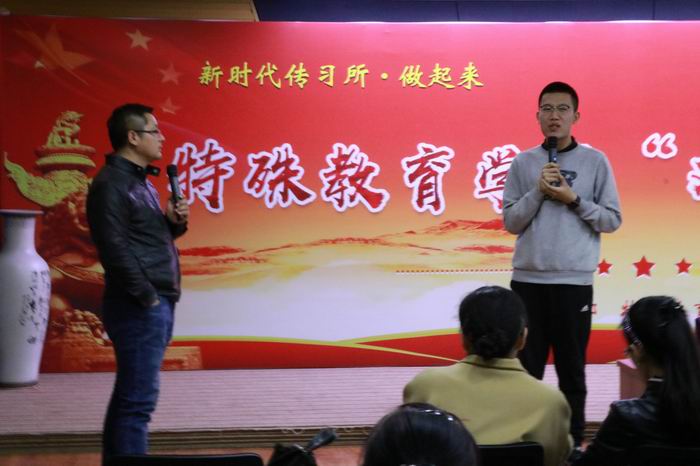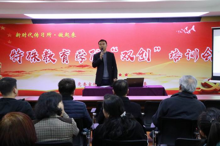 为深入学习贯彻十九大精神,践行习近平总书记提出的“发展是第一要务,人才是第一资源,创新是第一动力”的要求,4月11日,“新时代习所”学习贯彻党的十九大精神宣讲团走进特殊教育学院暨特殊教育学院“双创”工作培训班在学院会议厅举行。学校党委宣传部、创新创业学院相关负责人、学校各学院负责创新创业的教师,特殊教育学院领导班子、学院部分师生参加了培训班。活动由特殊教育学院党委书记王建光主持。