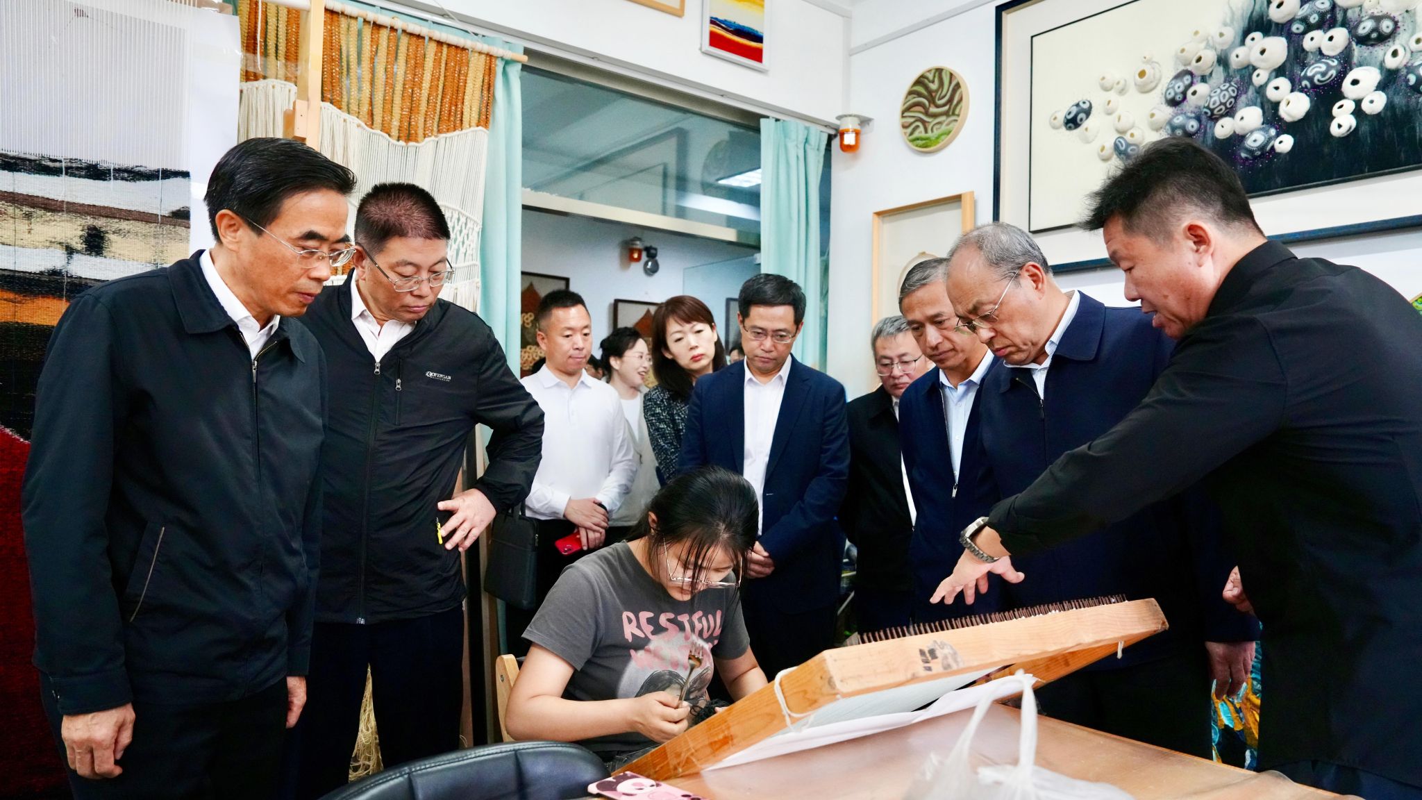 在特殊教育学院,调研组查看了孤独症融合康复研究中心建设情况,深入到纤维艺术工作室、蛋雕工作室现场观摩学生制作工艺品,观看了“光音之冀”残疾大学生艺术团的演出排练,并与学生代表亲切交流。