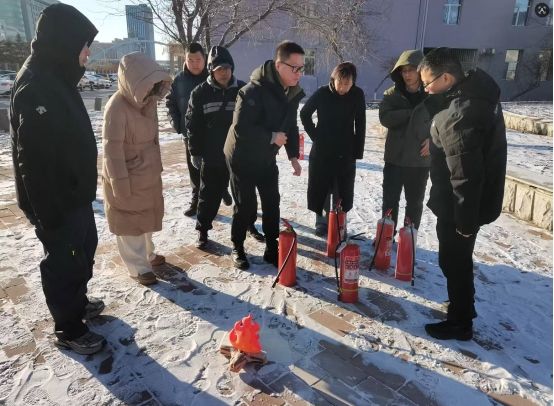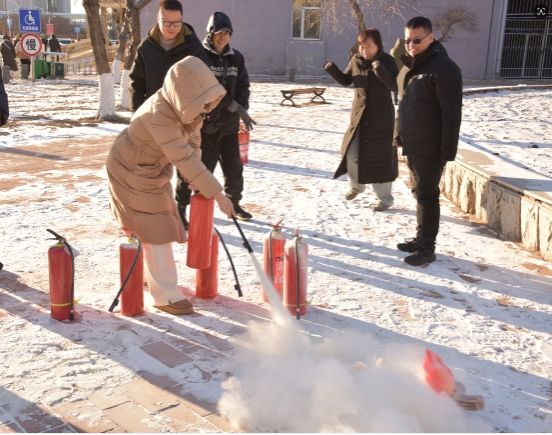 在学院前楼东侧空地,师生们在学校安全处教师的指导下,利用火焰模型进行灭火器实际操作训练,亲身实践“提、拔、握、压”灭火器使用步骤,切实提升了应急处置能力。