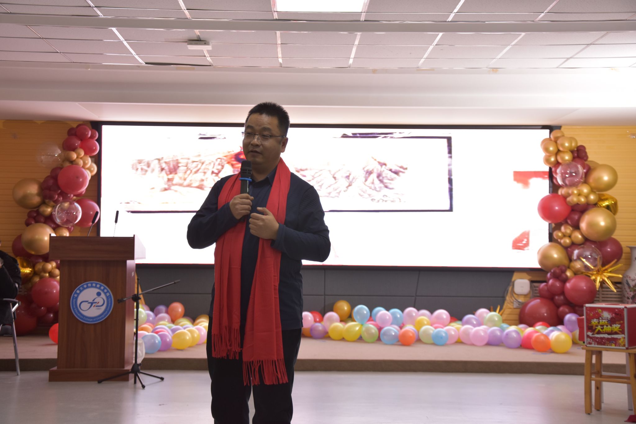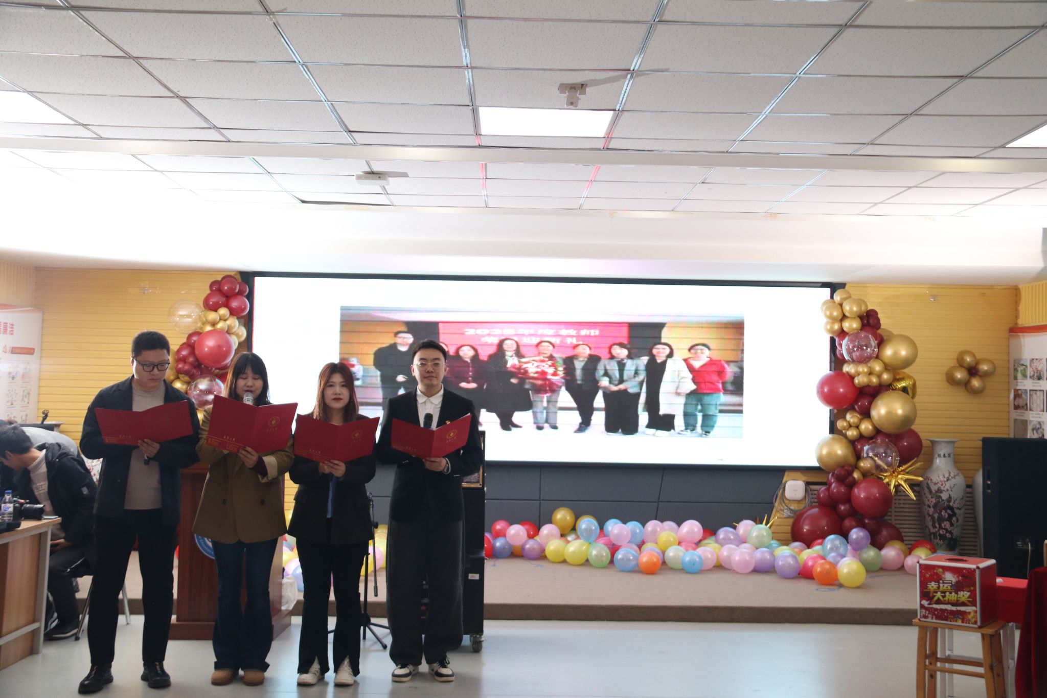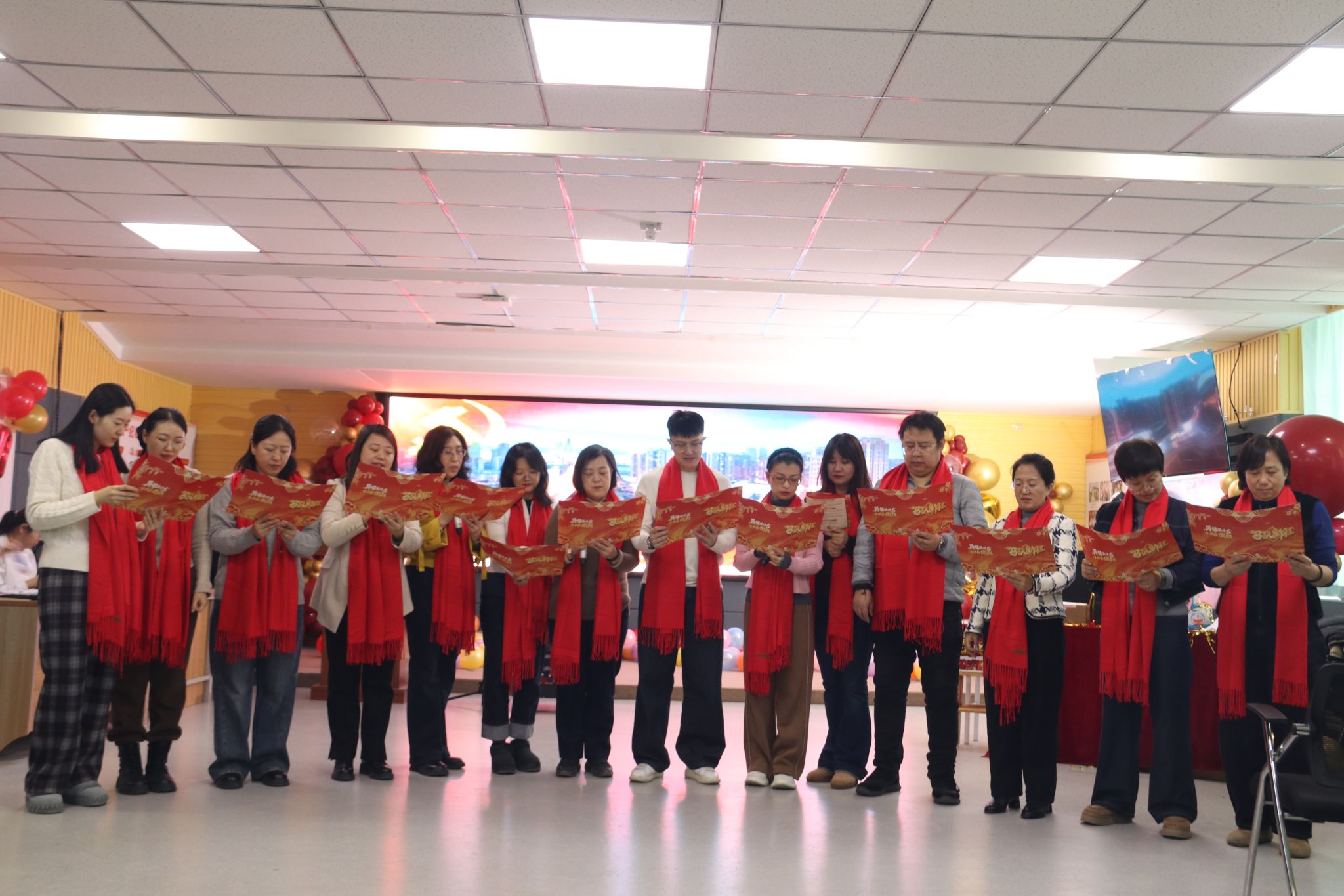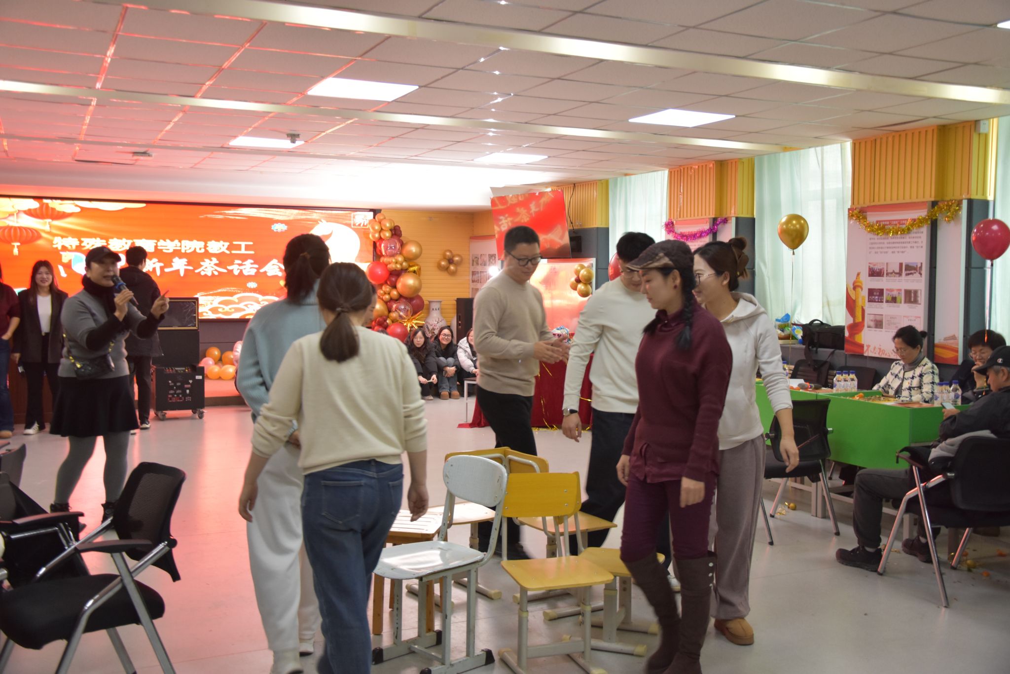 新年茶话会由学院工会精心筹备,以“我爱你中国”为红色主题,文艺节目精彩纷呈,青年教师开场舞活力四射,《游击队之歌》伴着教师打的节拍,由小合唱变成了大合唱;朗诵《融合新生2026,我们这样出发》传递责任温情,二胡独奏与脱口秀妙趣横生。“尖叫鸡”“抢凳子”“踩气球”等趣味游戏与抽奖环节将氛围推向高潮,老师们踊跃参与,欢声笑语不断。活动尾声,全体教职工拍摄“全家福”定格温馨瞬间,茶话会在新春祝福中落幕。