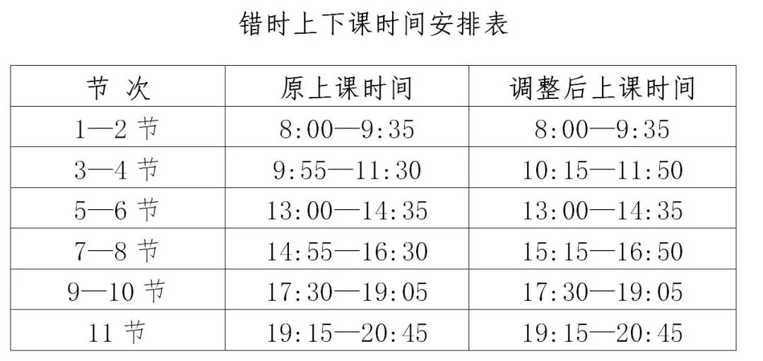 所有学生返校后,全校学生实行错时、错峰上下课(具体时间安排如表所示)。2019级、2020级本专科学生本学期执行调整后上课时间,其他年级学生执行原上课时间;2019级、2020级与其他年级混合的其他课程维持原上课时间。